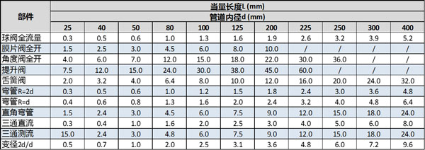 说明:某些管道连接件及其在不同直径管子中损失的影响,折算成当量长度,相当于增加管路的长度。